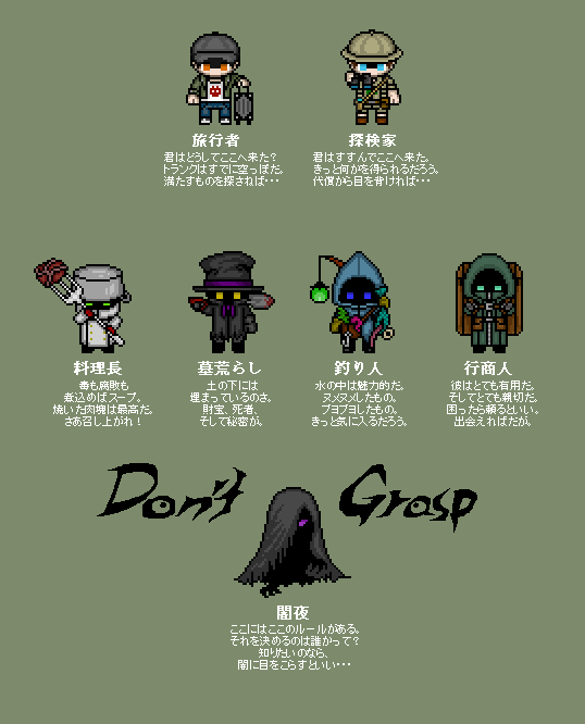 次回 ここはなんて恐ろしい場所だ! 荒れた海、暗い森、断崖絶壁、広い草原! そして震えるような夜が来る! それでも君は生きるんだ。 なんとしてでも、ね。 『Don’t Grasp』 2026年 夏 ねぇ今、誰かいた? 詳細は続きより 今年のエイプリルフールはサバイバル。 探して、作って、頑張って。 たまに怖い目に遭ったりして。 生き残ろう! PR