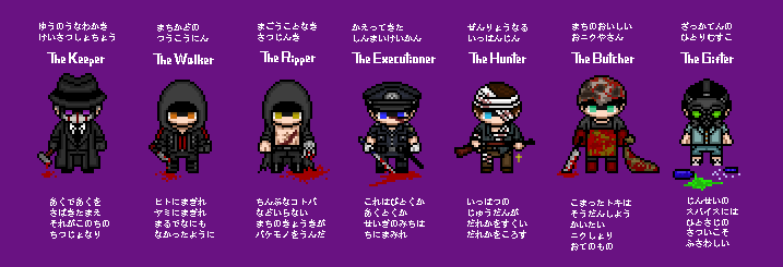 ハッピーハロウィーン キラーナイト! ここは殺人鬼の潜む街。 今日は人間がオバケの仮装をするので、 獄卒は人間の仮装をしてみました。 顔グラが無いので、ちょっとした自己紹介つき。 いかがでしょうか。 上手く紛れ込めるでしょうか。 今回はサイズ2倍にしたので、 クリックでいつもより大きく、文字も読める・・・はず。 PR